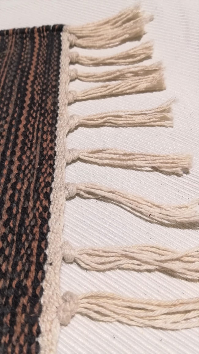 Precioso Durrie tejido de forma artesanal en India, en algodón sobre urdimbre también de algodón. Tiene una combinación de colores suave. El color dominante es el marrón, combinado con tonos más claros y en el centro el color natural del algodón sin teñir. Es apropiado para ambientes juveniles, vanguardistas, ambientes modernos, incluso casas de playa. También por su colorido puede adaptarse a decoraciones más clásicas. Se puede lavar, a mano, con agua y jabón. Es reversible.