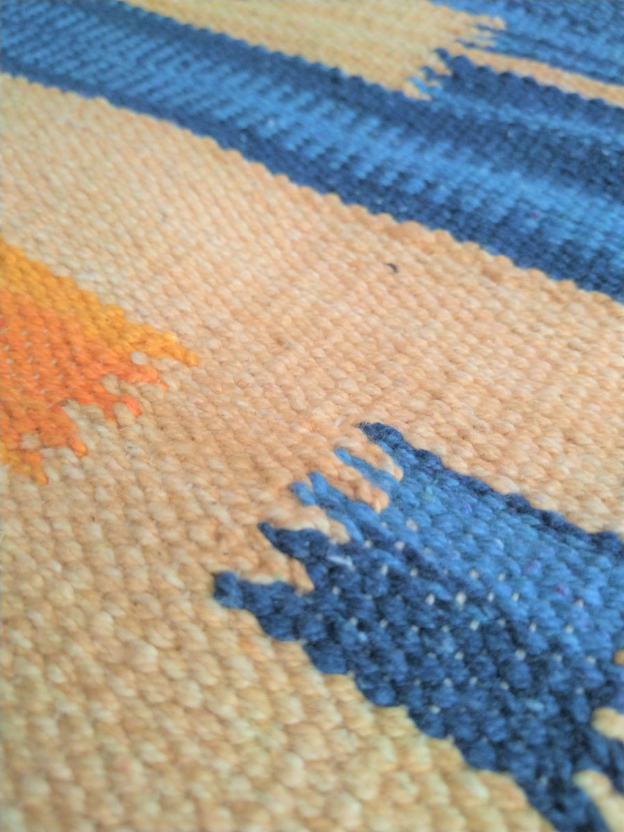 Precioso Durrie tejido de forma artesanal en India, en algodón sobre urdimbre también de algodón. La combinación de colores es muy luminosa. Es apropiado para un ambiente juvenil, vanguardista, ambiente moderno, incluso casas de playa. Es reversible. Disponemos de alfombras similares, en diversas medidas, para combinar en pasillos, dormitorios o salones. Se puede lavar, a mano, con agua y jabón.