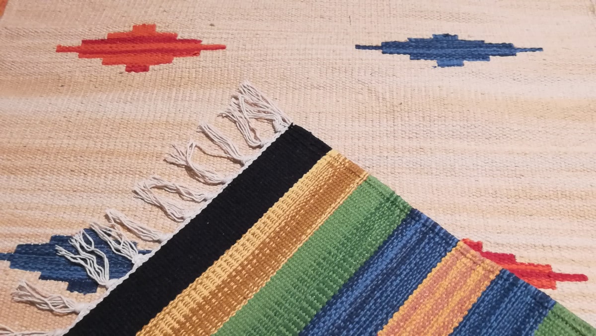 Estas alfombras están hechas artesanalmente en algodón con urdimbres y tramas también de algodón.