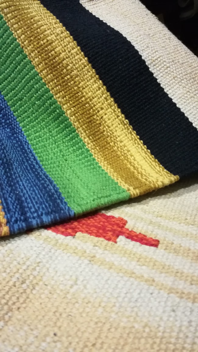 Precioso Durrie tejido de forma artesanal en India, en algodón sobre urdimbre también de algodón. La combinación de colores es muy clara y luminosa. El color dominante es el tono natural del algodón, sin teñir. Es apropiado para un ambiente juvenil, vanguardista, ambiente moderno, incluso casas de playa. Se puede lavar, a mano, con agua y jabón. Es reversible.