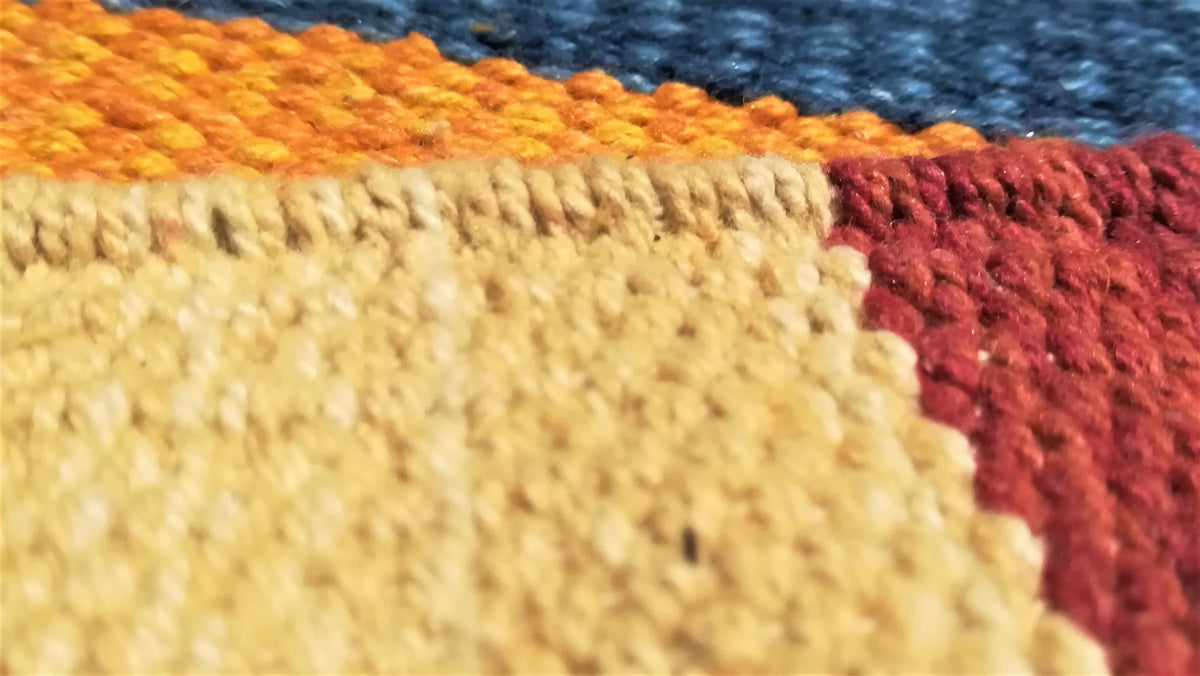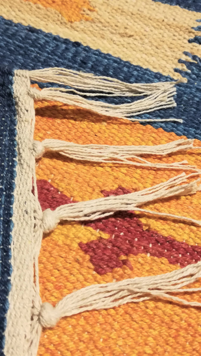 Precioso Durrie tejido de forma artesanal en India, en algodón sobre urdimbre también de algodón. La combinación de colores es muy luminosa. Es apropiado para un ambiente juvenil, vanguardista, ambiente moderno, incluso casas de playa. Es reversible. Disponemos de alfombras similares, en diversas medidas, para combinar en pasillos, dormitorios o salones. Se puede lavar, a mano, con agua y jabón.