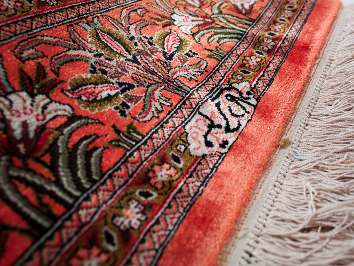 Alfombra Ghoum de seda, de gran belleza, nudo extrafino, con un gran búcaro de flores de multitud de colores y firmada por el artesano en la parte superior de la pieza. Puede ser utilizada también como tapiz. Se aprecia gran diferencia de tono según el ángulo de visión.