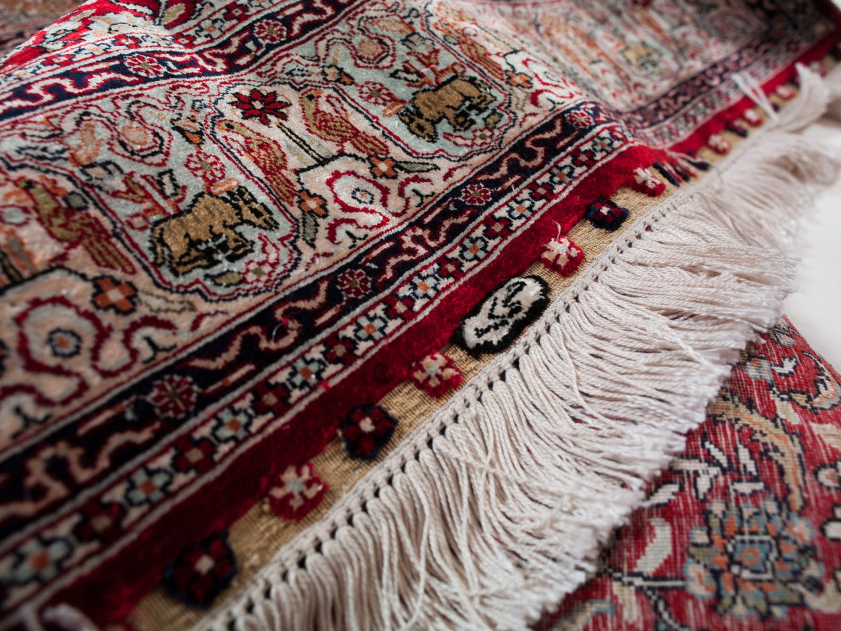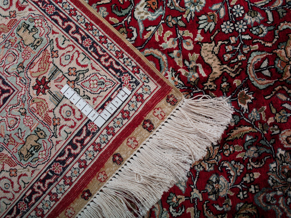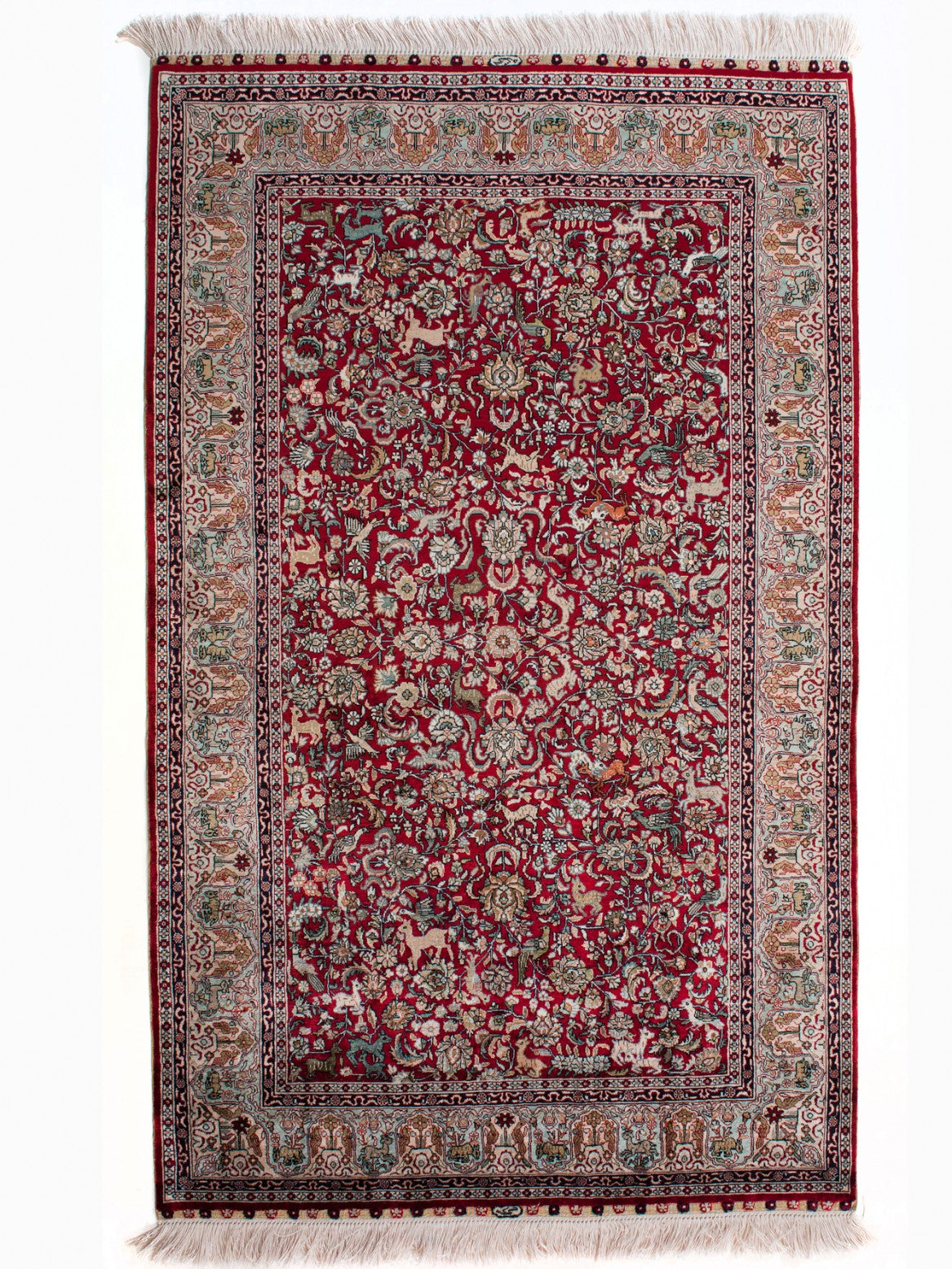 Alfombra anudada en seda que cuenta con gran cantidad de diseños de animales muy poco frecuentes en las alfombras orientales. Destaca el trabajo realizado en el Kilim tejido junto a los flecos en donde han anudado también la firma del artesano.